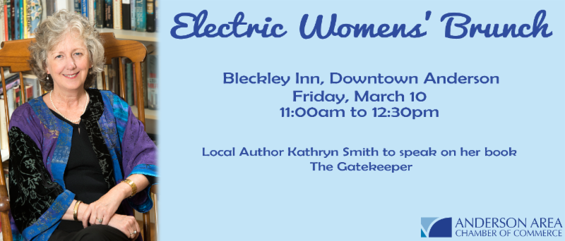 Bleckley Inn, Downtown AndersonIn a Women's History Month-themed presentation, Anderson author Kathryn Smith will speak in the persona of Marguerite Alice LeHand, the subject of her biography "The Gatekeeper: Missy LeHand, FDR and the Untold Story of the Partnership that Defined a Presidency." As "Missy," Kathryn will tell you about how a girl from a seedy area of Boston became the first and only woman to serve as White House Chief of Staff. She will also share some of the advances women made in government in the 1930s and 1940s, a period that saw the first woman appointed to the cabinet, Frances Perkins, and the arrival of the first "modern" first lady, Eleanor Roosevelt. Kathryn will have copies of her book available for $28, cash or check